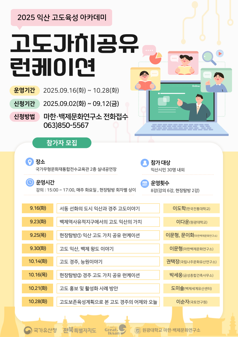 신청기간 : 9월 2일(화) ~ 9월 12일(금), 09:00 ~ 17:00 (※점심시간 및 공휴일 제외) 신청접수 : 063-850-5567, 마한백제문화연구소 전화 접수 역사와 문화에 관심 있는 시민 여러분의 많은 참여를 기다립니다! |