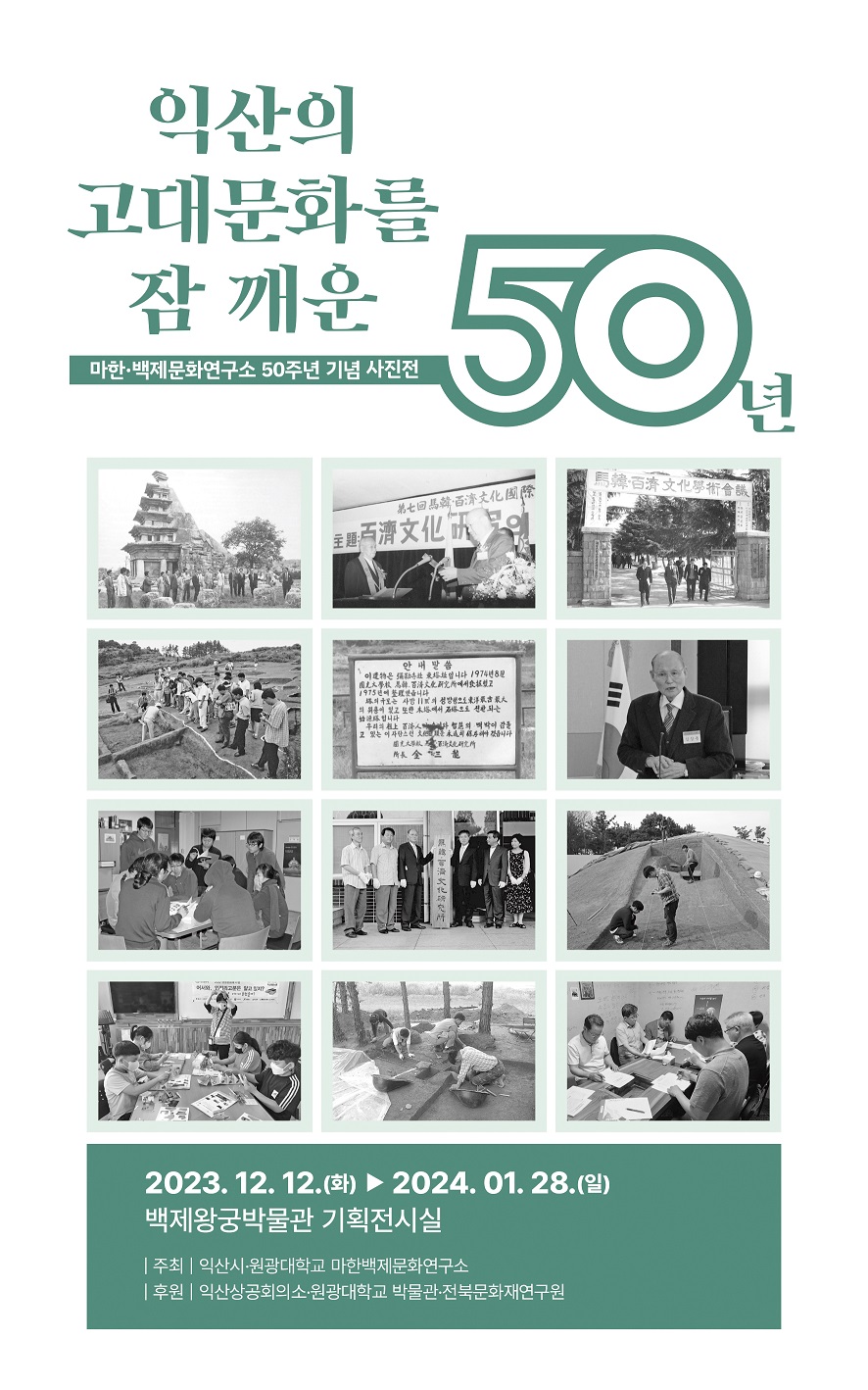 원광대학교 마한‧백제문화연구소(소장 유지원)는 익산시(시장 정헌율)와 2023년 12월 12일부터 2024년 1월 28일까지 백제왕궁박물관 기획전시실에서 <익산의 고대문화를 잠 깨운 50년>을 주제로 마한백제문화연구소 50주년 기념 사진전을 개최한다. 이번 전시는 1970년대 이후 익산지역의 문화유산이 조사 연구되어 온 지난 50여년 간의 여정을 담고 있는데, 그 여정의 순간 순간마다 익산의 시민들이 함께하고 있었다는 사실이 눈길을 끈다. 이번 전시는 대학과 지자체와 시민이 힘을 합하여 우리나라 4대 고도(古都), 세계유산도시로 성장해 온 역사문화도시 익산을 탐방할 수 있는 특별한 시간여행이 될 것으로 보인다. |